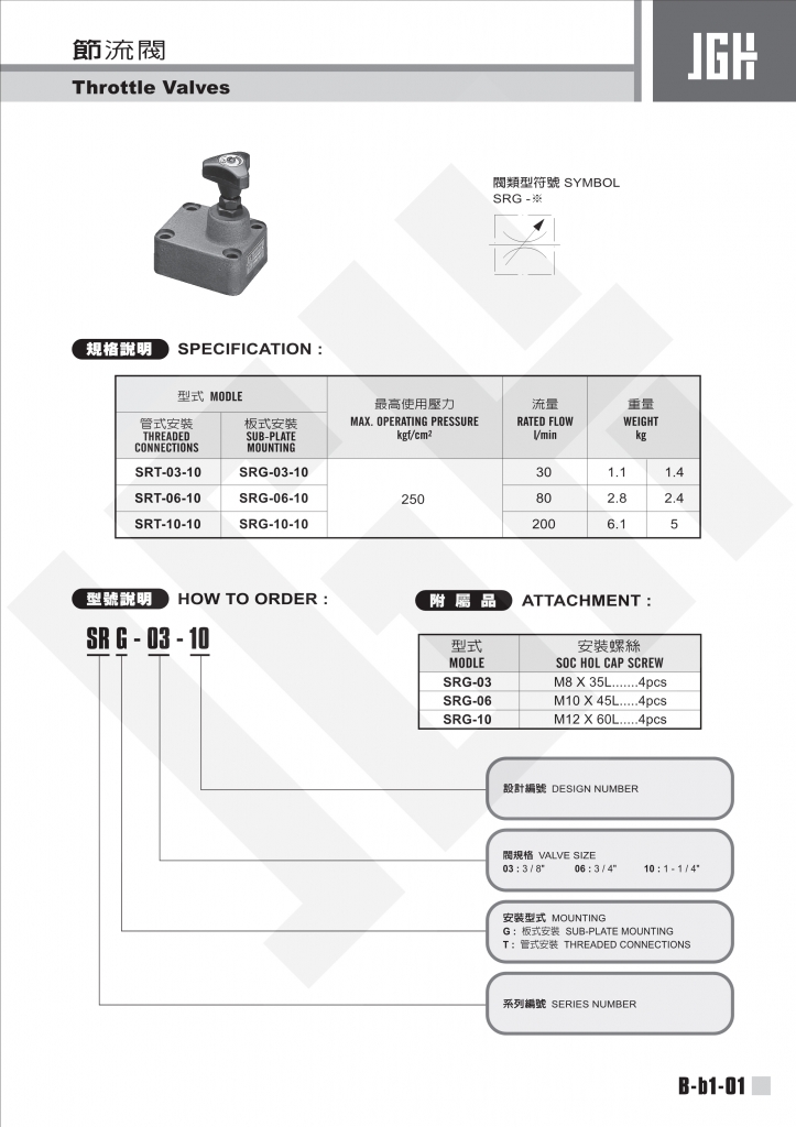 JGH節(jié)流閥常規(guī)型號(hào)參考:SRG-03-10 , SRG-06-10 , SRG-10-10 , SRT-03-10 , SRT-06-10 , SRT-10-10