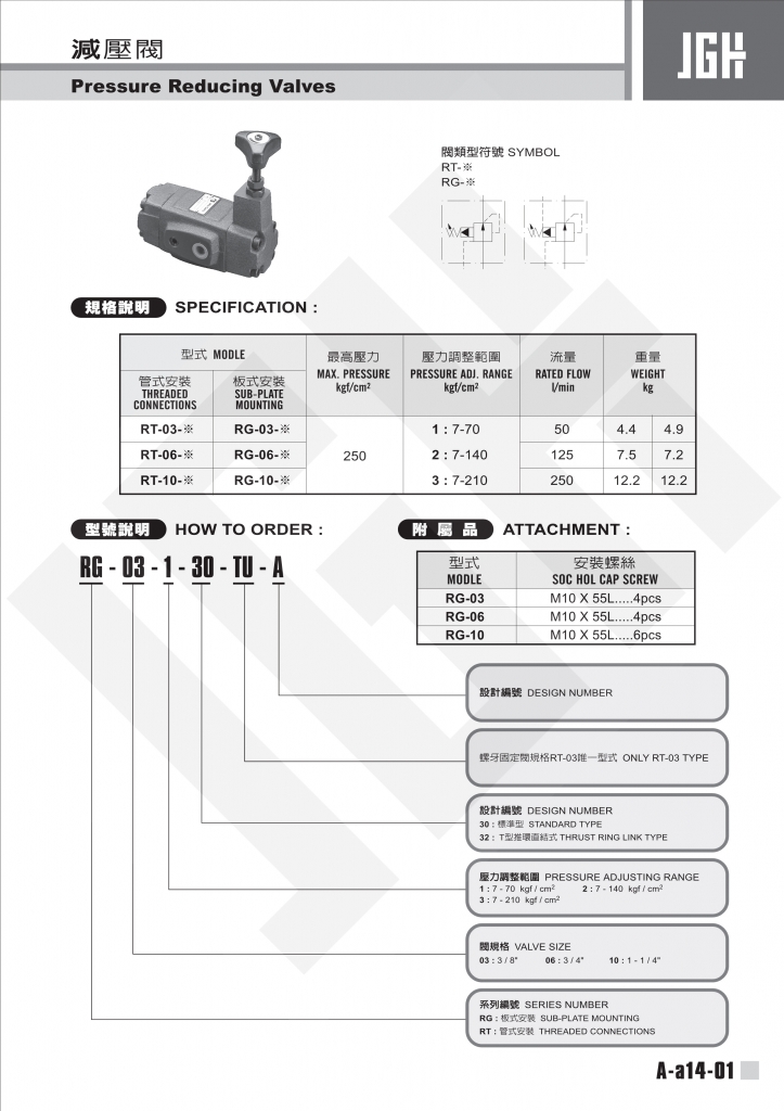 JGH減壓閥常規(guī)型號(hào)參考:RG-03-1 , RG-03-2 , RG-03-3 , RG-06-1 , RG-06-2 , RG-06-3 , RG-10-1 , RG-10-2 , RG-10-3 , RT-03-1 , RT-03-2 , RT-03-3 , RT-06-1 , RT-06-2 , RT-06-3 , RT-10-1 , RT-10-2 , RT-10-3