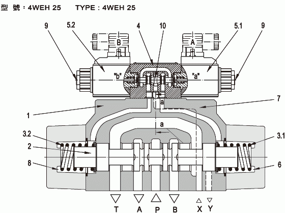 - 此類閥組成主要包括閥體(1)、控制閥芯(2)和一個或二個復(fù)位彈簧(3.1)和(3.2)的主閥及帶一個或二個電磁”a”(5.1), 電磁閥”b”(5.2)的先導(dǎo)閥(4)。