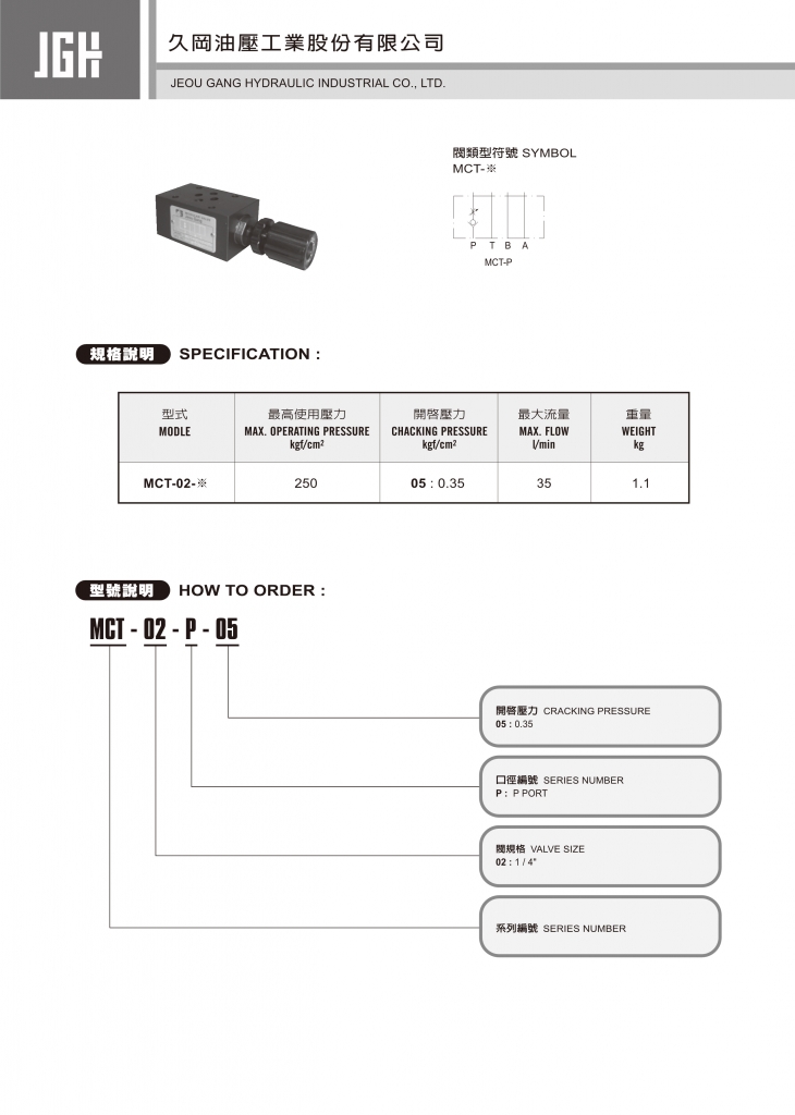 規(guī)格說明 型式 最高使用壓力 kgf/cm2 最大流量 l/min 重量 kg MCT-02-※ 250 05:0.35 1.1 JGH疊加式止逆節(jié)流閥部分常規(guī)型號參考:MCT-02-P-05