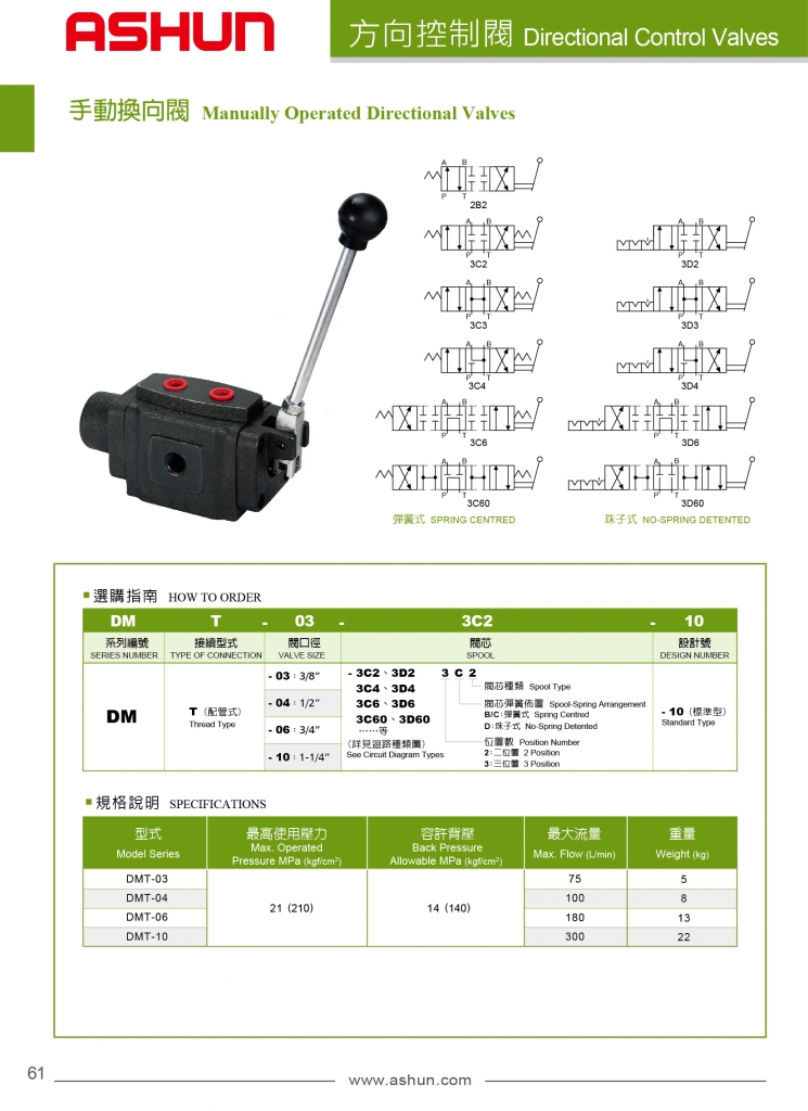 ASHUN手動換向閥部分常規(guī)型號參考:DMT-03-2B2-10 , DMT-03-2B4-10 , DMT-03-2B6-10 , DMT-03-3C2-10 , DMT-03-3C4-10 , DMT-03-3C6-10 , DMT-03-3D2-10 , DMT-03-3D4-10 , DMT-03-3D6-10 , DMT-04-2B2-10 , DMT-04-2B4-10 , DMT-04-2B6-10 , DMT-04-3C2-10 , DMT-04-3C4-10 , DMT-04-3C6-10 , DMT-04-3D2-10 , DMT-04-3D4-10 , DMT-04-3D6-10 , DMT-06-2B2-10 , DMT-06-2B4-10 , DMT-06-2B6-10 , DMT-06-3C2-10 , DMT-06-3C4-10 , DMT-06-3C6-10 , DMT-06-3D2-10 , DMT-06-3D4-10 , DMT-06-3D6-10 , DMT-10-2B2-10 , DMT-10-2B4-10 , DMT-10-2B6-10 , DMT-10-3C2-10 , DMT-10-3C4-10 , DMT-10-3C6-10 , DMT-10-3D2-10 , DMT-10-3D4-10 , DMT-10-3D6-10