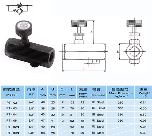 CLC流量控制閥部分常規(guī)型號參考:PT-02 , PT-03 , PT-04 , PT-06 , PT-02N , PT-03N