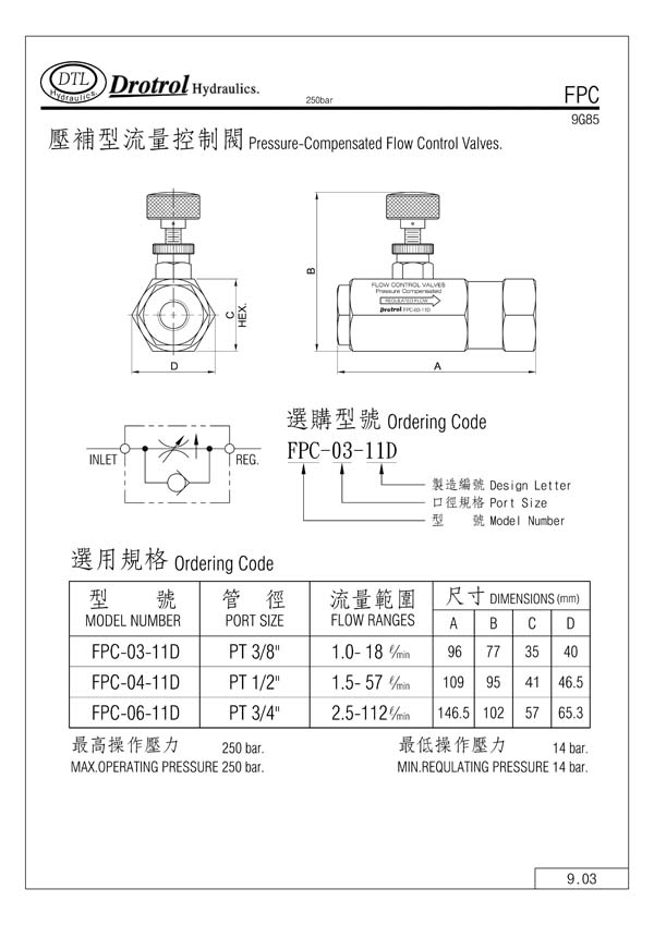 DTL壓補型流量控制閥部分常規(guī)型號參考:FPC-03-11D , FPC-04-11D , FPC-06-11D