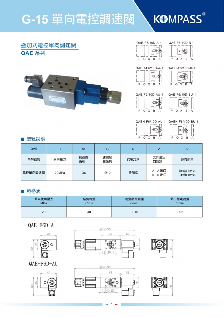 KOMPASS疊加式電控單向調(diào)速閥部分常規(guī)型號參考:QAE-F6/10D-A , QAE-F6/10D-AU , QAE-F6/10D-B , QAE-F6/10D-BU