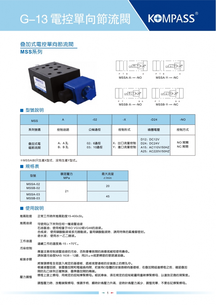 KOMPASS康百世疊加閥 MSSA,MSSB-02,03系列疊加式電控單向節(jié)流閥
