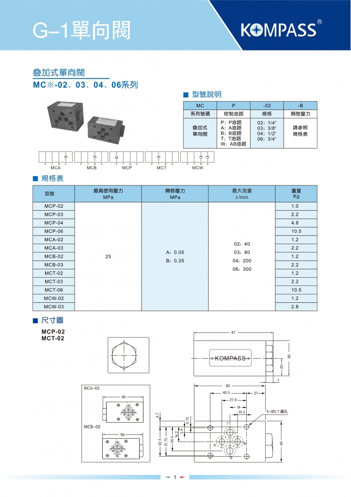 KOMPASS康百世疊加閥 MCP,MCA,MCB,MCT,MCW系列疊加式單向閥