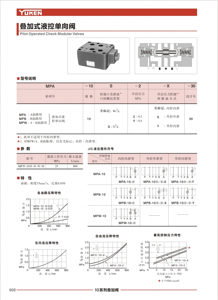 YUKEN油研疊加閥 MPA,MPB,MPW-10系列疊加式液控單向閥