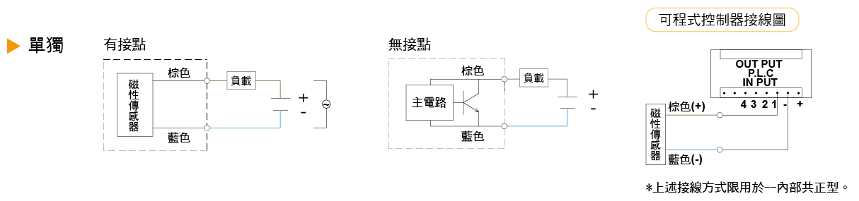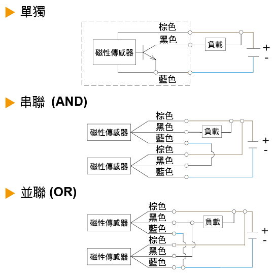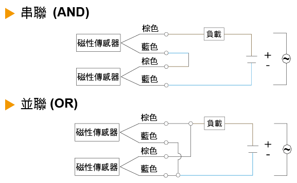 當(dāng)二線式串連時(shí),不能超過(guò)兩個(gè)磁性傳感器預(yù)定額度的內(nèi)部降壓 (內(nèi)部降壓:2.5 ~ 4V/per switch) 否則會(huì)導(dǎo)致負(fù)載的不動(dòng)作。
