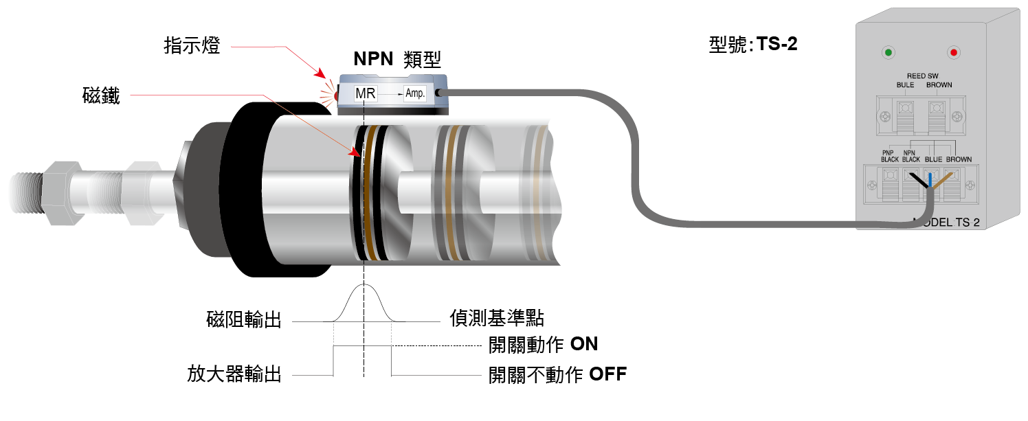 當(dāng)氣壓缸動(dòng)作,裝置在活塞內(nèi)的磁鐵向磁性傳感器接近時(shí),磁性傳感器內(nèi)的磁阻將會(huì)感應(yīng)到磁場(chǎng)的改變,并產(chǎn)生微量電壓變化。透過(guò)內(nèi)部集成電路的放大,推動(dòng)晶體而導(dǎo)通電路。